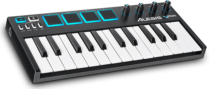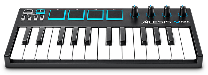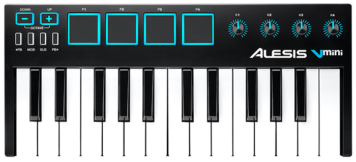 Alesis Midi keyboard 25 πλήκτρωνμε mini-size μέγεθος, 4 pads, 4 ποντεσιόμετρα, πλήκτρα Octave UP- Down, συνδεσιμότητα USB. Το V- Mini βοηθάει τον μουσικό που χρησιμοποιεί μουσικό λογισμικό να ενισχύσει την ιδέα-εμπειρία κάνοντας την περισσότερο απλή και δημιουργική. Με την θύρα USB όχι μόνο μεταφέρονται πληροφορίες αλλά τροφοδοτείται και το keyboard. Τα Pads και τα ποντεσιόμετρα είναι φωτιζόμενα. Το V Mini προσφέρεται με το Xpandl2 της AIR Music Tech, το οποίο παρέχει πάνω από 2000 ήχους υψηλής ποιότητας. Η συσκευασία περιλαμβάνει καλώδιο USB.
