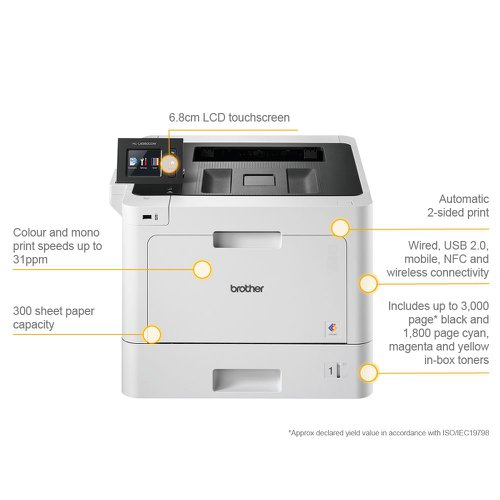 O HL-L8360CDW της Brother διαθέτει αποκλειστικά λειτουργία εκτύπωσης. Χρησιμοποιεί τεχνολογία laser και μπορεί να τυπώσει τόσο έγχρωμα, όσο και ασπρόμαυρα. Μέσω καλωδίου ethernet ή WiFi έχει τη δυνατότητα να συνδεθεί στο δίκτυό σας και έτσι να μπορέσετε να εκτυπώσετε από οποιονδήποτε υπολογιστή ή κινητό από απόσταση, χωρίς να χρειάζεται η σύνδεση μέσω καλωδίου USB. Προσφέρει αυτόματη εκτύπωση διπλής όψης και έτσι δεν χρειάζεται να γυρίζετε εσείς το χαρτί χειροκίνητα. Ξεχωρίζει για την μεγάλη ταχύτητα με την οποία τυπώνει ασπρόμαυρες σελίδες, φτάνοντας τις 31 ανά λεπτό, καλύπτοντας τις ανάγκες εκτύπωσης των περισσότερων γραφείων. Είναι συμβατός με Windows, Mac και Linux. Λειτουργεί με 4 δοχεία toner. Οι διαστάσεις του είναι 44.196Χ48.514X31.242cm.