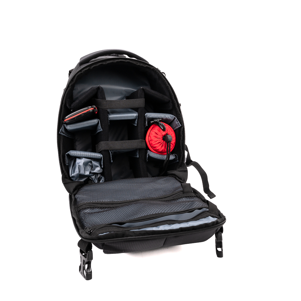 The Skydex 120 has a main compartment which is divided in two sections. The back section is padded and has dividers that can be placed in the desired position. The front section can be found in the sealing cap. This is a mesh compartment provided with two zips where cables can be stored in a neat way.