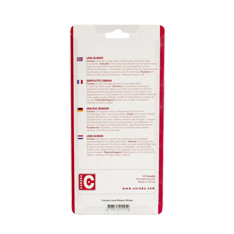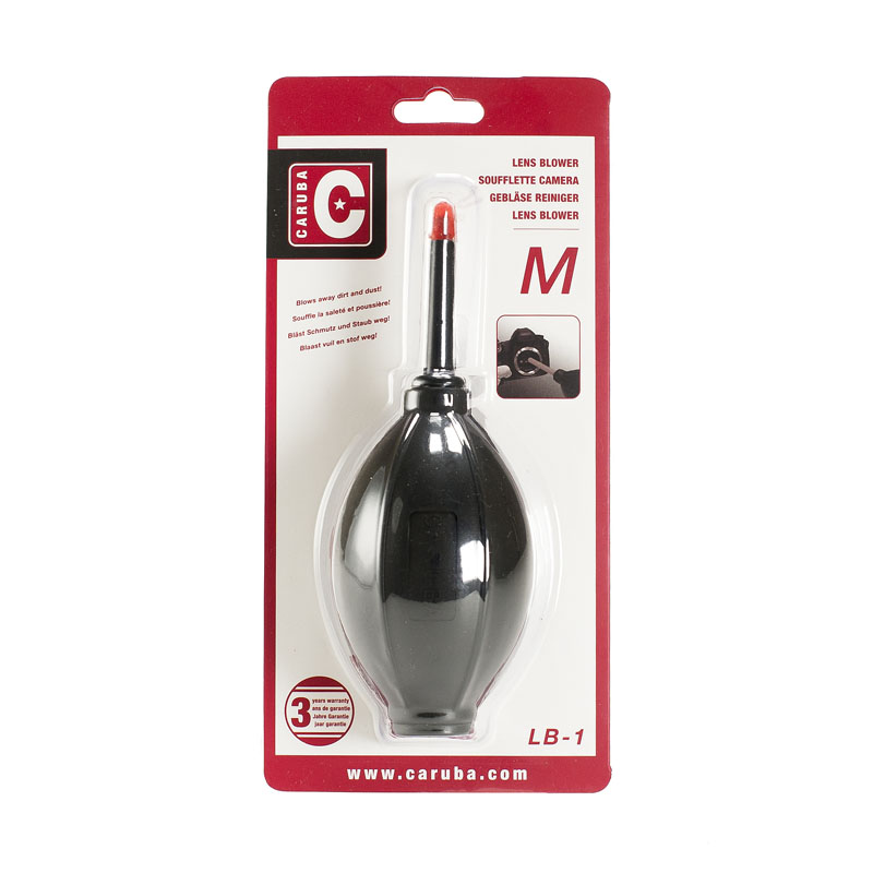 The Caruba Small Blower is a handy tool for cleaning your precious equipment. With this blower you can quickly blow away dust and other dirt such as grains of sand from your lens, camera or binoculars. Caruba's Small Blower is handy and easy to use and comes in a blister pack.
