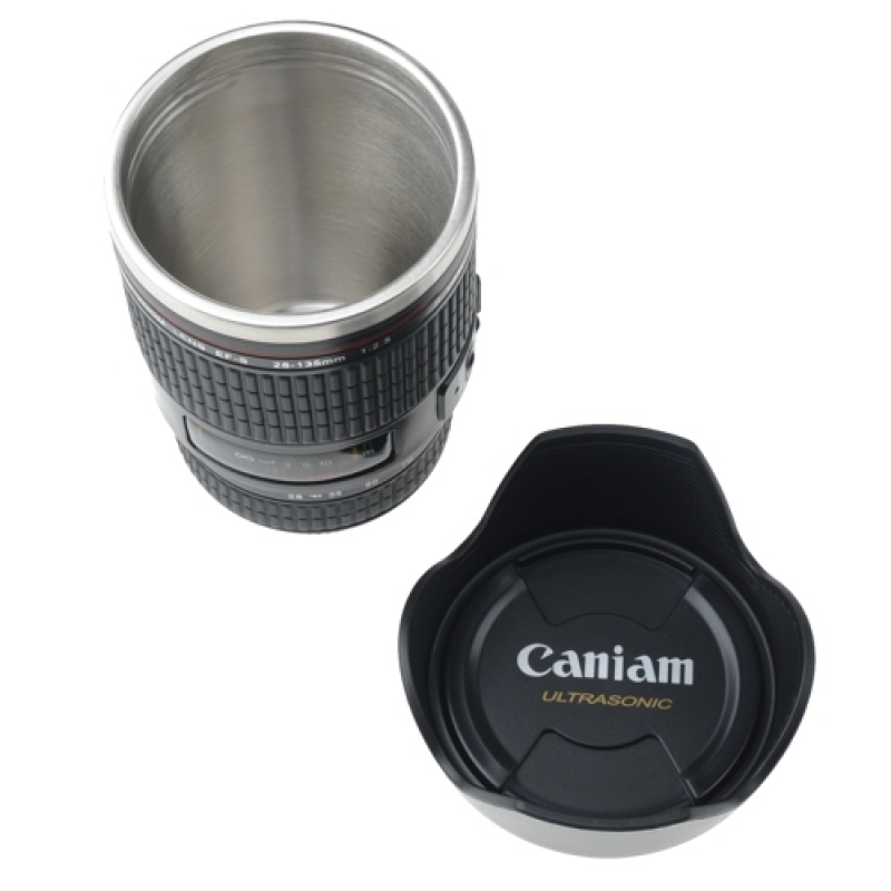 The outside of the drinking cup is shaped like a camera lens and features the same textures and details, making it an eye-catching and remarkable design. The inside of the cup is made of stainless steelwhich makes it a convenient and practical solution on the go or in the office.