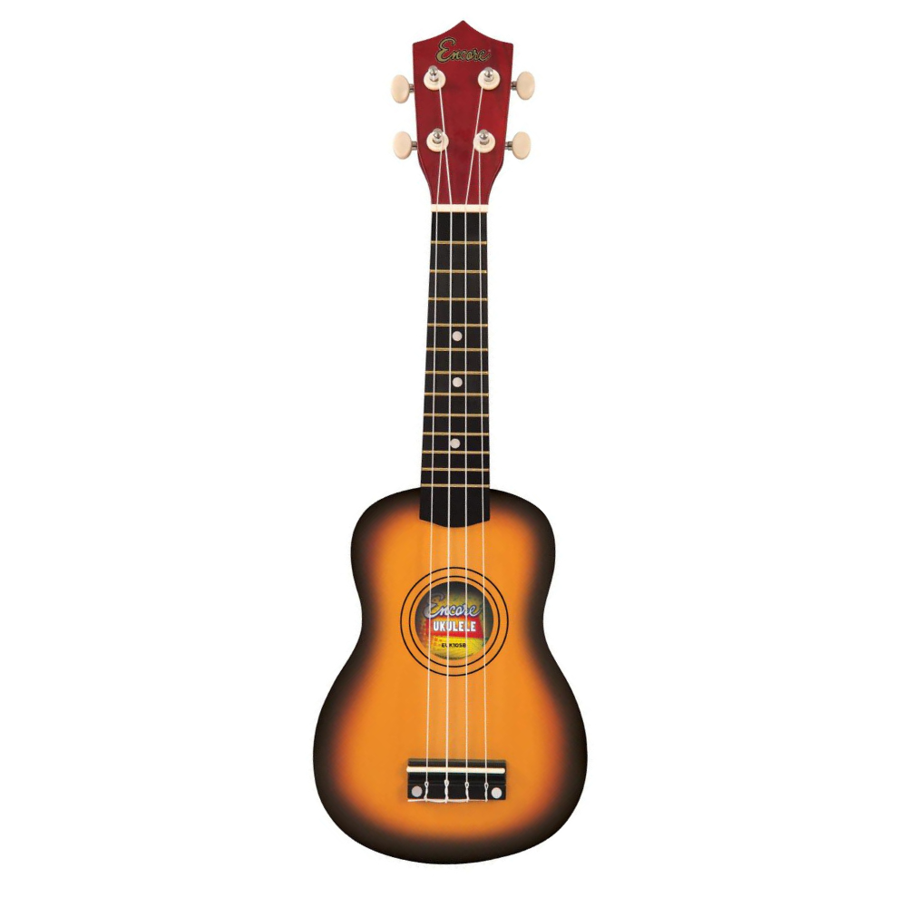 Encore Ukulele EUK10 SUNBURST The Encore soprano sized ukulele with wooden body offers great tone and excellent sound projection. Nylon strung with oval buttoned machine heads for accurate tuning. Attractively packaged.