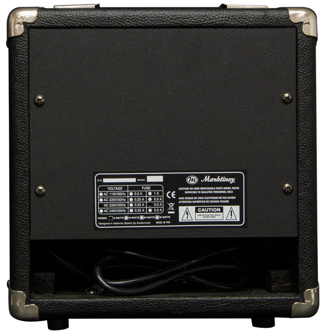 Ενισχυτής ηλεκτρικής κιθάρας 10W, ρυθμιστικά έντασης, πρίμα, μπάσα, Overdrive (on-off), input, έξοδος ακουστικών, μεγάφωνο 6,5", διαστάσεις: 260x255x140mm, βάρος: 5kg. Κατασκευαστής Marktinez. Προέλευση: Κίνα