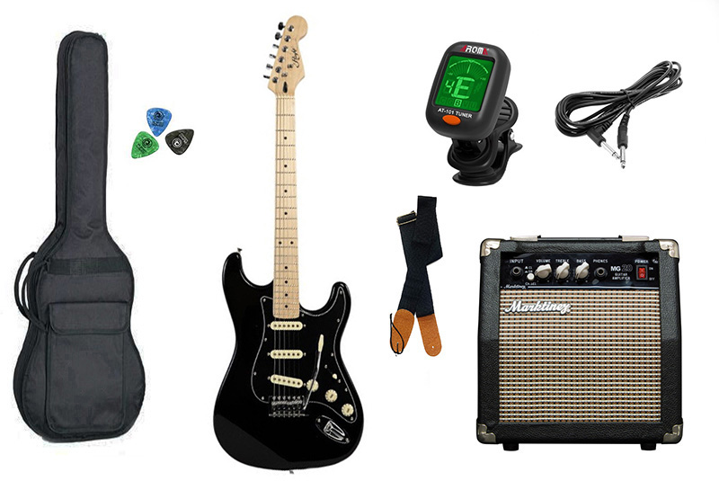 1 x ενισχυτή κιθάρας Marktinez MG-20 10W. Ρυθμιστικά έντασης, πρίμα, μπάσα, Overdrive (on-off), input, έξοδος ακουστικών, μεγάφωνο 6,5", διαστάσεις: 260x255x140mm, βάρος: 5kg. 1 x μαλακή θήκη ηλεκτρικής κιθάρας Jack and Danny, με διπλές ζώνες για την πλάτη. 1 x ζώνη κιθάρας Jack and Danny μαύρη, 1 x καλώδιο 3m για σύνδεση κιθάρα ενισχυτή, 4 x πέννες Daniel, και 1 x Ψηφιακό Chromatic Clip-Tuner Aroma AT-101