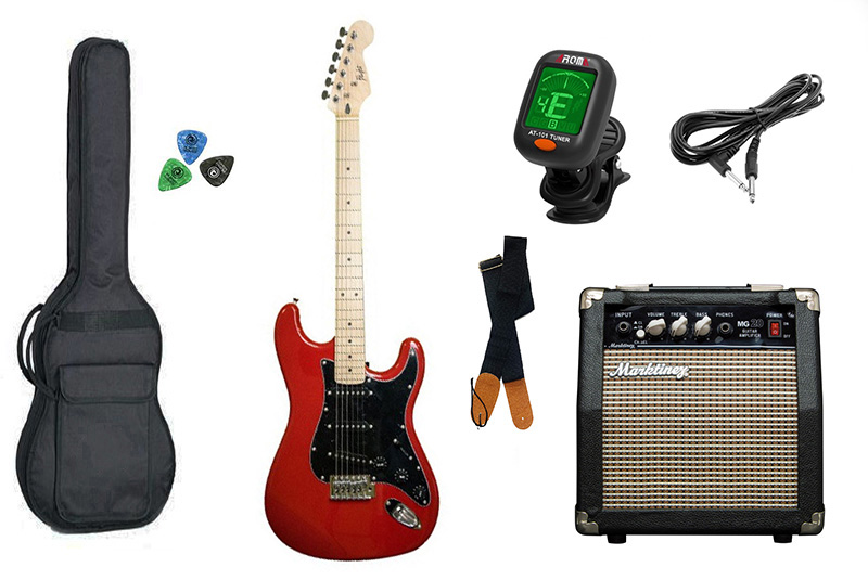 1 x ενισχυτή κιθάρας Marktinez MG-20 10W. Ρυθμιστικά έντασης, πρίμα, μπάσα, Overdrive (on-off), input, έξοδος ακουστικών, μεγάφωνο 6,5", διαστάσεις: 260x255x140mm, βάρος: 5kg. 1 x μαλακή θήκη ηλεκτρικής κιθάρας Jack and Danny, με διπλές ζώνες για την πλάτη. 1 x ζώνη κιθάρας Jack and Danny μαύρη, 1 x καλώδιο 3m για σύνδεση κιθάρα ενισχυτή, 4 x πέννες Daniel, και 1 x Ψηφιακό Chromatic Clip-Tuner Aroma AT-101