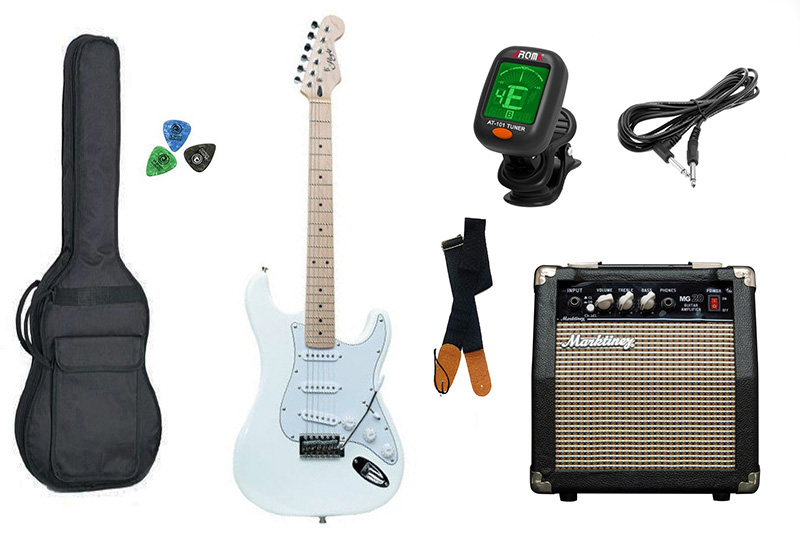 1 x ενισχυτή κιθάρας Marktinez MG-20 10W. Ρυθμιστικά έντασης, πρίμα, μπάσα, Overdrive (on-off), input, έξοδος ακουστικών, μεγάφωνο 6,5", διαστάσεις: 260x255x140mm, βάρος: 5kg. 1 x μαλακή θήκη ηλεκτρικής κιθάρας Jack and Danny, με διπλές ζώνες για την πλάτη. 1 x ζώνη κιθάρας Jack and Danny μαύρη, 1 x καλώδιο 3m για σύνδεση κιθάρα ενισχυτή, 4 x πέννες Daniel, και 1 x Ψηφιακό Chromatic Clip-Tuner Aroma AT-101