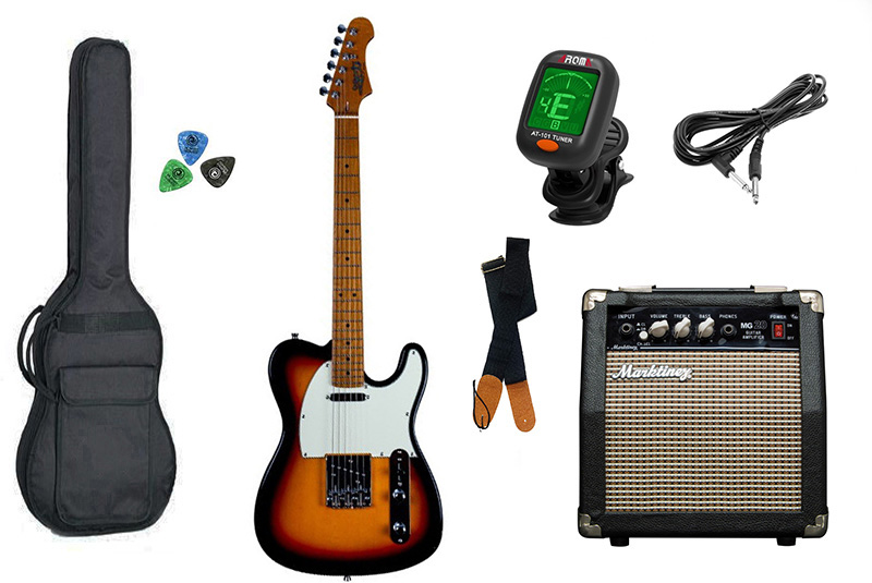 1 x ενισχυτή κιθάρας Marktinez MG-20 10W. Ρυθμιστικά έντασης, πρίμα, μπάσα, Overdrive (on-off), input, έξοδος ακουστικών, μεγάφωνο 6,5", διαστάσεις: 260x255x140mm, βάρος: 5kg. 1 x μαλακή θήκη ηλεκτρικής κιθάρας Jack and Danny, με διπλές ζώνες για την πλάτη. 1 x ζώνη κιθάρας Jack and Danny μαύρη, 1 x καλώδιο 3m για σύνδεση κιθάρα ενισχυτή, 4 x πέννες Daniel, και 1 x Ψηφιακό Chromatic Clip-Tuner Aroma AT-101