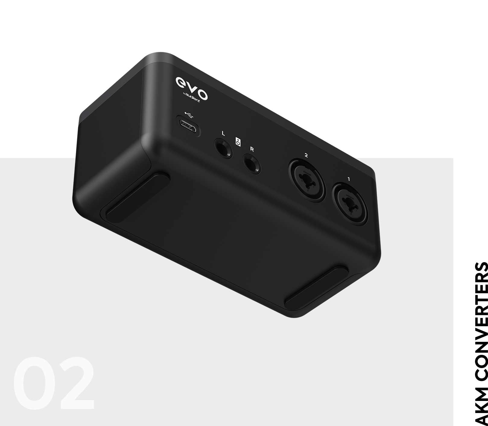 EVO 4 by Audient. Capture your microphones and instruments and start recording audio directly to your computer with EVO 4’s intuitive feature set.Combining leading tech specs with incredible performance and sound quality, EVO 4 is the perfect interface for beginners and pros alike. By Audient, Smartgain mode, Loopback functionality,24-Bit/96 kHz,113 dB Dynamic range, AD/DA, 2 Combined mic/line inputs via XLR/jack combis, 2 Mic preamps with 58 dB gain, 48V Phantom power (also during bus operation) , Discrete JFET instrument input, Independent headphone output (6.3 mm jack), Multifunctional large rotary control with LED ring,DSP-based software mixer with flexible routing matrix, Class compliant with MAC, Windows (07/08/10), iOS, Power supply connection via USB-C, Includes a USB cable (1.5 m) and an extensive Audient ARC downloadable software package