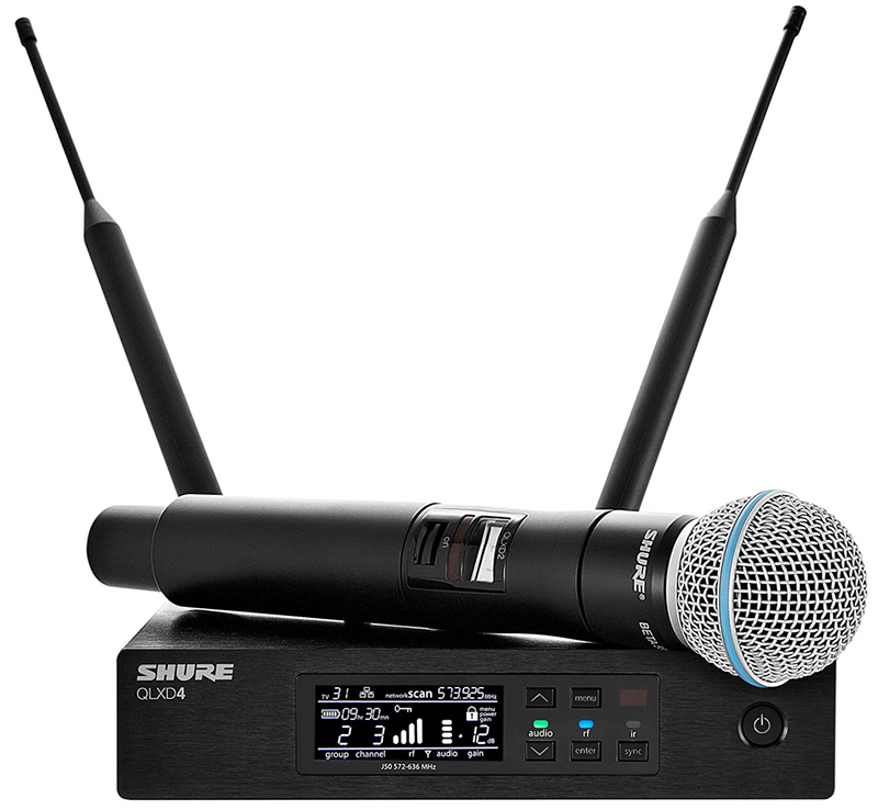 The SHURE QLXD24E/G51 Handheld Wireless Microphone System featuring a BETA 58A handheld wireless microphone transmitter. The System combines professional features with simplified setup and operation. The Digital Wireless Receiver QLXD4 is part of the System which quickly finds open frequencies and deploys them to transmitters via the one-touch sync function.