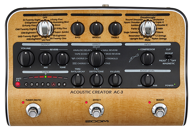 Εάν θέλετε να προσθέσετε βάθος και χρώμα στον ήχο,το AC-3 διαθέτει τα καλύτερα εφέ που έχει δημιουργήσει ποτέ η ZOOM για ακουστικά όργανα. Υπάρχουν 9 επιλογές εφέ, που συμπεριλαμβάνουν reverb, delay, chorus κ.α. με τη δυνατότητα να ρυθμίσετε τις επί μέρους παραμέτρους του κάθε εφέ. Ένα χαρακτηριστικό που κάνει την AC-3 να ξεχωρίζει είναι και ο επιλογέας 16 κιθαριστικών preset, που σας επιτρέπει να διαλέξετε τον τύπο της κιθάρας σας. Υπάρχει διαφορετική επιλογή για όλα τα γνωστά είδη κιθάρας όπως Dreadnought, Jumbo, Οrchestra κ.α.. Για να γίνει ακόμη πιο ρεαλιστική η προσέγγιση, υπάρχει και διακόπτης όπου επιλέγετε τον τύπο που μεταδίδεται ο ήχος στο όργανό σας μεταξύ piezo ή μαγνήτη.