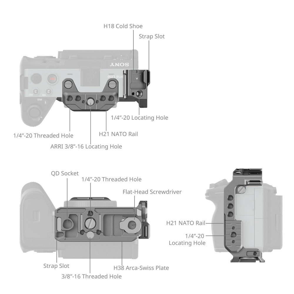 The cage is also compatible with traditional cold shoe, NATO Clamp and Arca-Swiss Clamp eco accessories. In addition, the cage has built-in 1/4"-20 screw holes, ARRI 3/8"-16 locating hole, 1/4"-20 locating holes, QD socket and strap slot, and can be expanded with accessories for professional creations. A magnetic key is also included for easy mounting and dismounting.